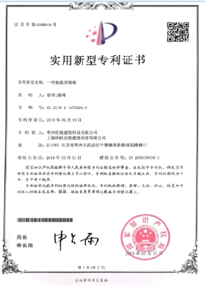 实用新型专利证书:一种保温预制板用保温钉以及保温钉固定结构