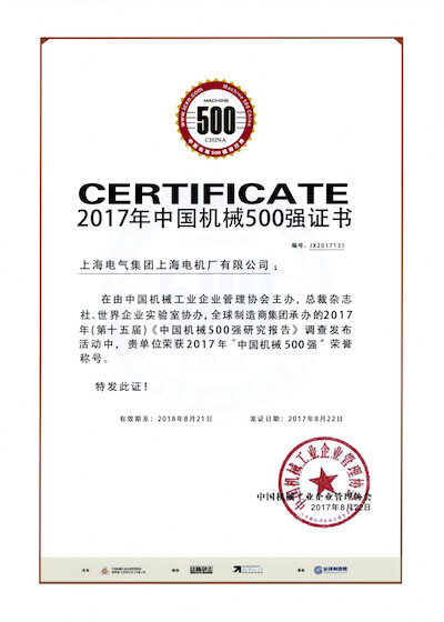 获得2017年中国机械500强证书
