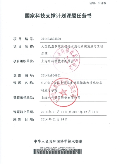 2014年承担国家科技部“十二五”国家科技支撑计划课题