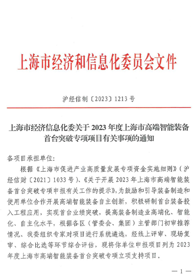 2023年上海市高端智能装备首台突破专项项目奖励