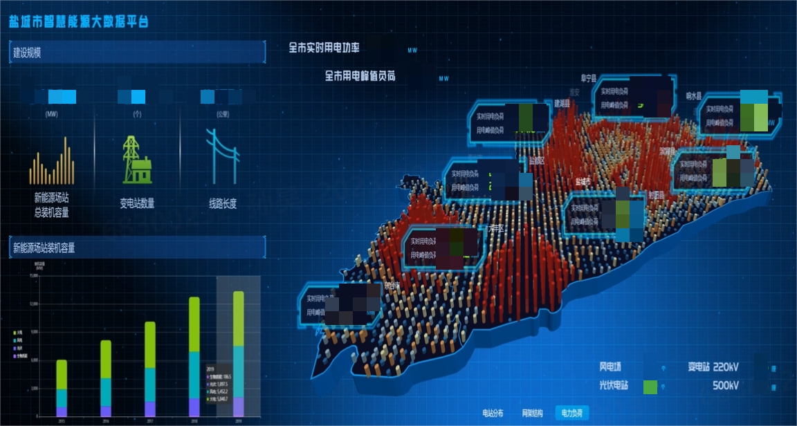 盐城市,坐落于江苏省东部,有着582公里海岸线,风光资源丰富。盐城市政府大力发展新能源建设,是长三角地区首个千万千瓦新能源发电城市。sunbet申搏官方网站基于星云智汇轻量化平台,为盐城市打造能源大数据平台,汇集盐城市新能源风光场站供电数据与主要用电企业的能耗数据,实现城市能源一张图,实时展现城市资源禀赋与项目开发情况、城市电网架构和能耗分布以及城市“源网荷”监控,为盐城市新能源发展和管理决策提供了数据支撑。