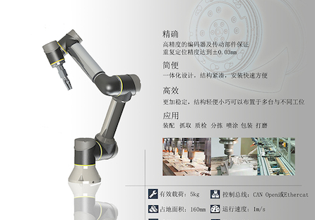 A six-Axis Robot with Man-Machine Cooperative Function Composed of Joint Modules . Through the controller, the safety functions such as force feedback and collision detection can be realized, and the safety can be guaranteed in the environment of man-machine cooperation. Dragging teaching function can make it quickly applied to various working environments. Its characteristic is high precision and modular design.