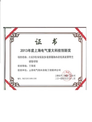 3rd Prize of Shanghai Electric Science and Technology Innovation Award in 2013