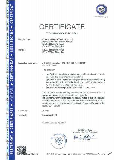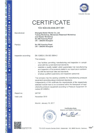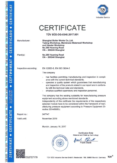 PED Certificate EN 12952-5, EN ISO 3834-2