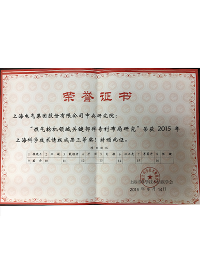 Shanghai Science and Technology Information Achievement Award 2015年-“燃气轮机领域关键部件专利布局研究”荣获2015年上海科学技术情报成果 三等奖