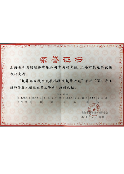 Shanghai Science and Technology Information Achievement Award 2014年-“超导电力技术发展现状及趋势研究”-上海科学技术情报成果 三等奖
