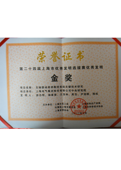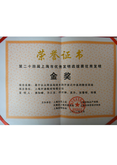 Gold Award by the 24nd Shanghai Outstanding Invention Competition 2012年-“基于以太网总线技术的开放式中高档数控系统”第二十四届上海市优秀发明选拔赛 金奖1