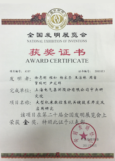 Gold Award by National Exhibition of Inventions 2011年-“大型机床数控系统关键技术开发及应用研究”-全国发明展览会 金奖
