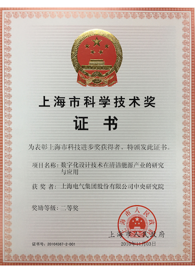 Shanghai Science and Technology Progress Award 2010年-“数字化设计技术在清洁能源产业的研究与应用”-上海市科学技术奖 二等奖