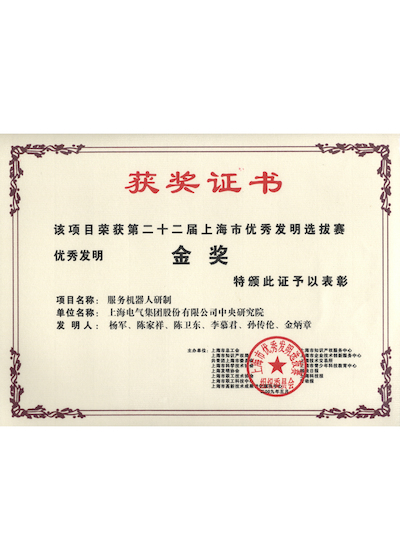Gold Award by the 22nd Shanghai Outstanding Invention Competition 2009年-服务机器人研制-第二十二届上海市优秀发明选拔赛优发明“金奖”
