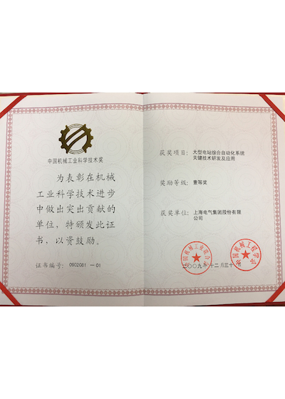 China Machinery Industry Science and Technology Award 2009年-大型电站综合自动化系统关键技术研发及应用