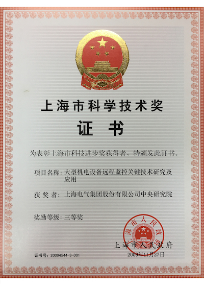 Shanghai Science and Technology Progress Award 2009年-“大型机电设备远程监控关键技术研究及应用”-上海市科学技术奖 三等奖