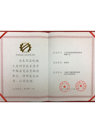 China Machinery Industry Science and Technology Award 2008年-大功率低速船用柴油机曲轴国产化--中国机械工业科学技术二等奖
