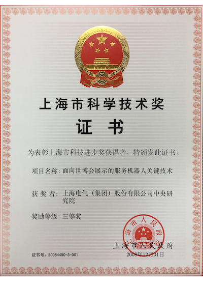 Shanghai Science and Technology Progress Award 2008年-“面向世博会展示的服务机器人关键技术”-上海市科学技术奖 三等奖
