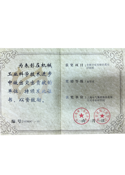 Machinery Industry Science and Technology Progress Award 2005年-“全数字化控制的柔性印刷机”-表彰在机械工业科学技术进步三等奖
