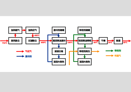 针对生物质气化燃气中飞灰、焦油、水三大主要污染物的有序脱除,开发基于干湿法组合工艺的飞灰焦油协同脱除技术和基于露点控制原理的多级焦油捕集的深度脱除技术。采用自主研发的新型吸收剂,依据不同阶段露点温度的合理控制对不同种类焦油进行依次脱除和吸收剂的高效循环再生。针对部分原料和特殊下游工艺对硫、氯等污染物控制的要求,研发模块化脱硫脱氯装置以满足不同应用市场。