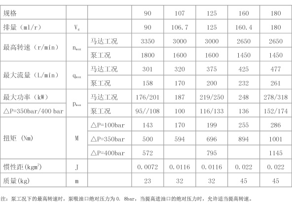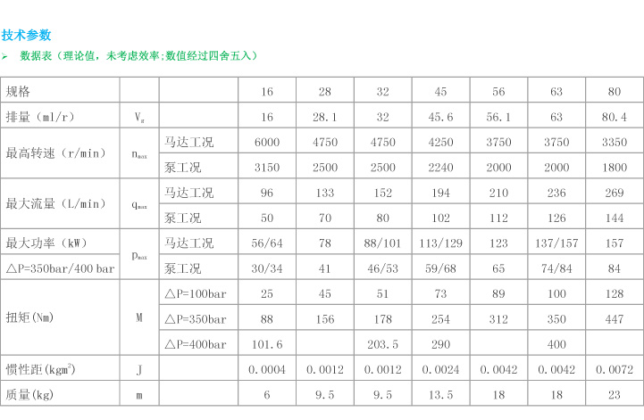 • 4.在马达工况时,输出转速与流量成正比而与排量成反比,扭矩随高低压侧的压差以及排量的增加而增加