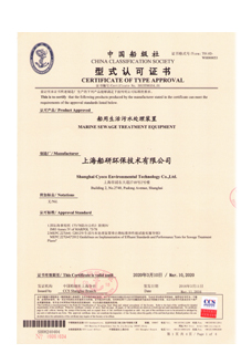 中国船级社型式认可证书:船用生活污水处理装置
