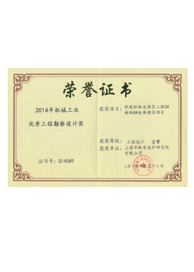 2014年机械工业优秀工程勘察设计奖 工程设计壹等奖