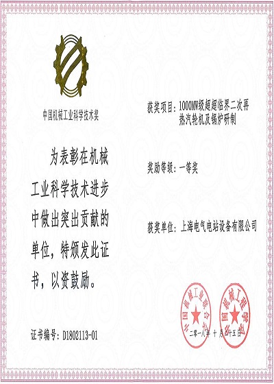 中国机械工业科学技术奖-1000MW级超超临界二次再热汽轮机及锅炉研制