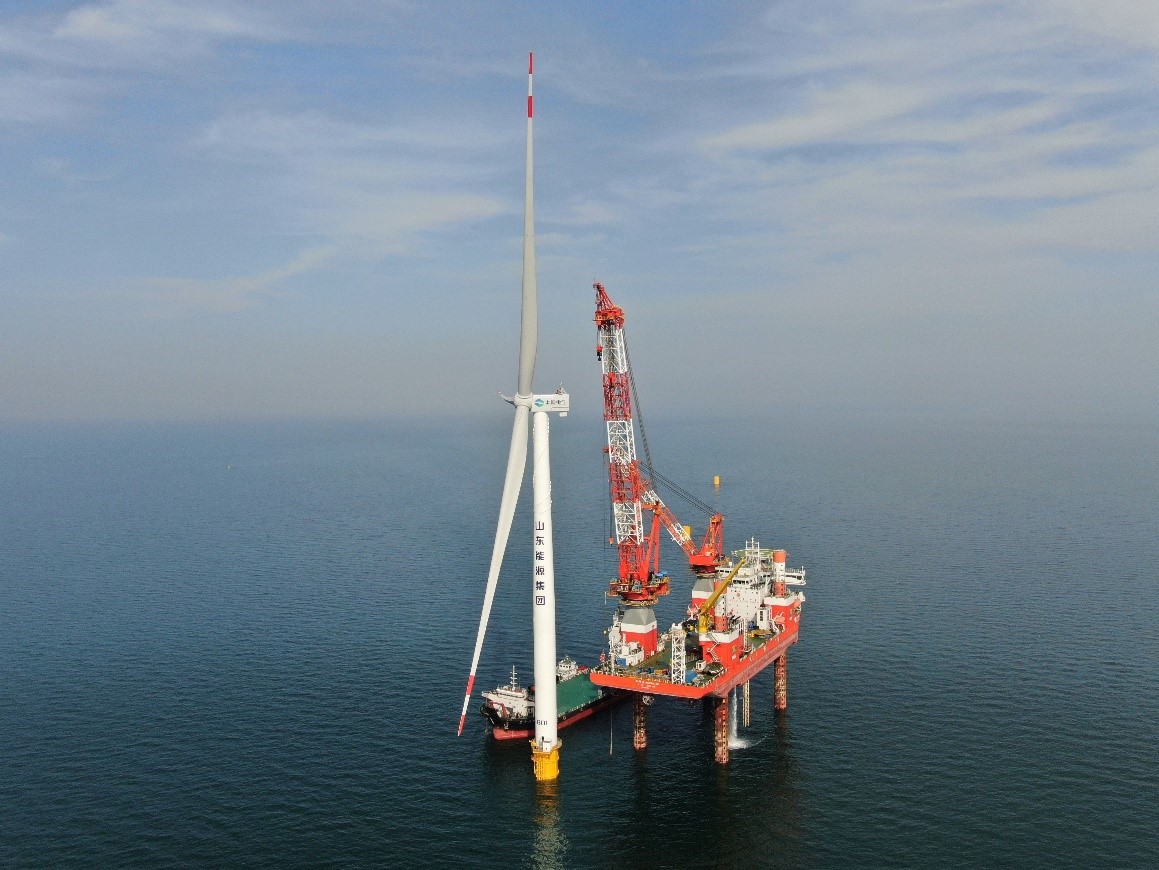 山能渤中 B 厂址海上风电项目位于东营市东营港北部海域,厂址离岸距离约 19 公里,建设规模 399.5MW,共安装 47 台海神平台 EW8.5-230 机组,项目历时 121 天,创造了同规模以上风场最短工期记录,同时该机组是当时全球商业化运行轮毂高度最高、叶轮直径最长的海上风力发电机组。该机组作为山东省“十四五”规划首批海上平价风电项目,同时是山东省政府2022年重点督办工程。