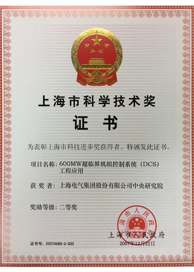 Shanghai Science and Technology Progress Award 2007年-“600MW超临界机组控制系统(DCS)工程应用-上海市科学技术奖 二等奖