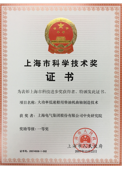 Shanghai Science and Technology Progress Award 2007年-”大功率低速船用柴油机曲轴制造技术“ 上海市科学技术奖 一等奖