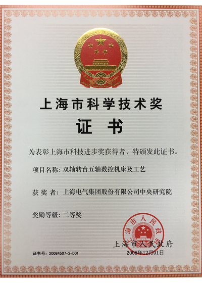 Shanghai Science and Technology Progress Award 2008年-”双轴转台五轴数控机床及工艺“-上海市科学技术奖 二等奖