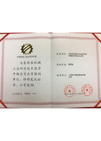 China Machinery Industry Science and Technology Award 2009年-大型电站综合自动化系统关键技术研发及应用