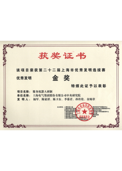 Gold Award by the 22nd Shanghai Outstanding Invention Competition 2009年-服务机器人研制-第二十二届上海市优秀发明选拔赛优发明“金奖”