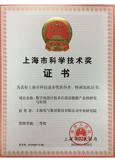 Shanghai Science and Technology Progress Award 2010年-“数字化设计技术在清洁能源产业的研究与应用”-上海市科学技术奖 二等奖
