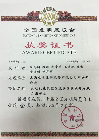 Gold Award by National Exhibition of Inventions 2011年-“大型机床数控系统关键技术开发及应用研究”-全国发明展览会 金奖