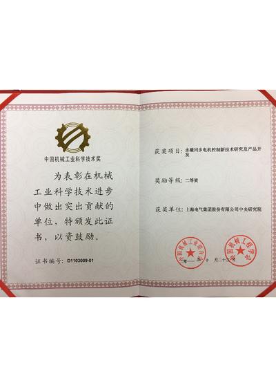 China Machinery Industry Science and Technology Award 2011年-永磁同步电机控制新技术研究及产品开发--中国机械工业科学技术奖二等奖