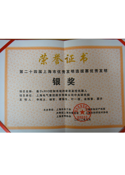 Silver Award by the 24nd Shanghai Outstanding Invention Competition 2012年-“基于cRIO控制系统的家居监控机器人”第二十四届上海市优秀发明选拔赛 银奖1