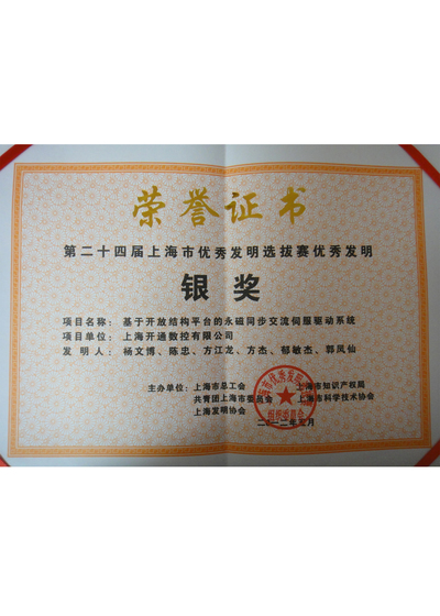 Silver Award by the 24nd Shanghai Outstanding Invention Competition 2012年-“基于开放式结构平台的永磁同步交流伺服驱动系统”第二十四届上海市优秀发明选拔赛 银奖1