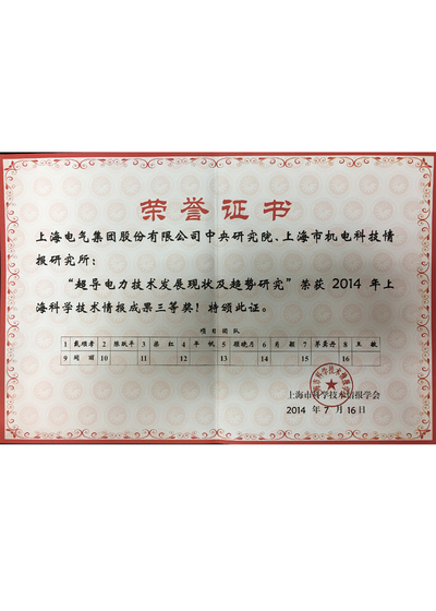 Shanghai Science and Technology Information Achievement Award 2014年-“超导电力技术发展现状及趋势研究”-上海科学技术情报成果 三等奖