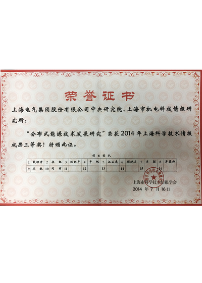 Shanghai Science and Technology Information Achievement Award 2014年-“分布式能源技术发展研究” 上海科学技术情报成果 三等奖