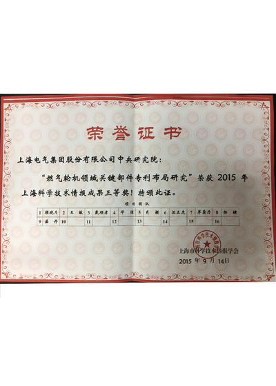 Shanghai Science and Technology Information Achievement Award 2015年-“燃气轮机领域关键部件专利布局研究”荣获2015年上海科学技术情报成果 三等奖