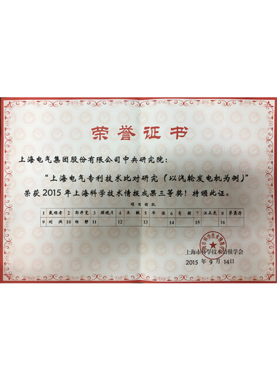 Shanghai Science and Technology Information Achievement Award 2015年-“sunbet申搏官方网站专利技术对比研究(以汽轮发电机为例)”-上海科学技术情报成果 三等奖